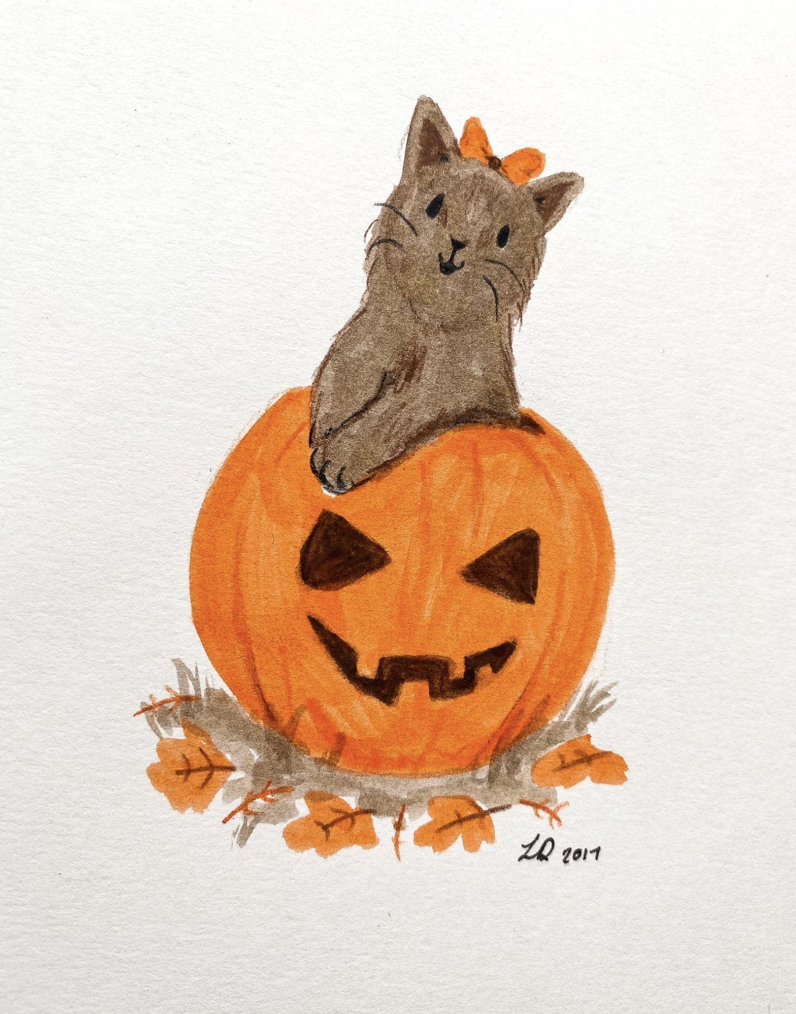 Original Autumn Cat Illustration – Ink & Watercolour Artwork 🎃🐱🍂