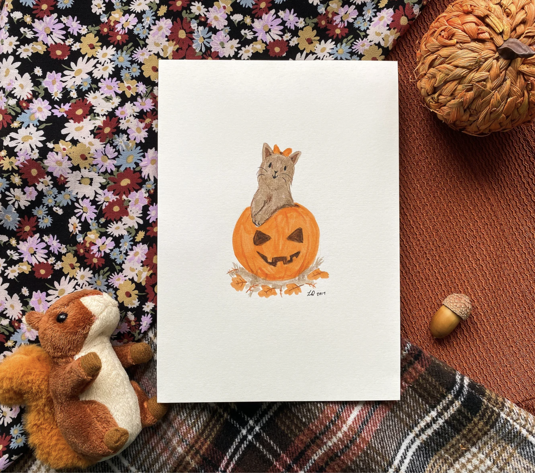 Celebrate the cosy magic of autumn with this original, one-of-a-kind illustration of a sweet brown cat peeking out from a pumpkin. Full of warmth and seasonal charm, this whimsical artwork is perfect for cat lovers, autumn decor fans, or anyone who enjoys playful, storybook-style illustration.