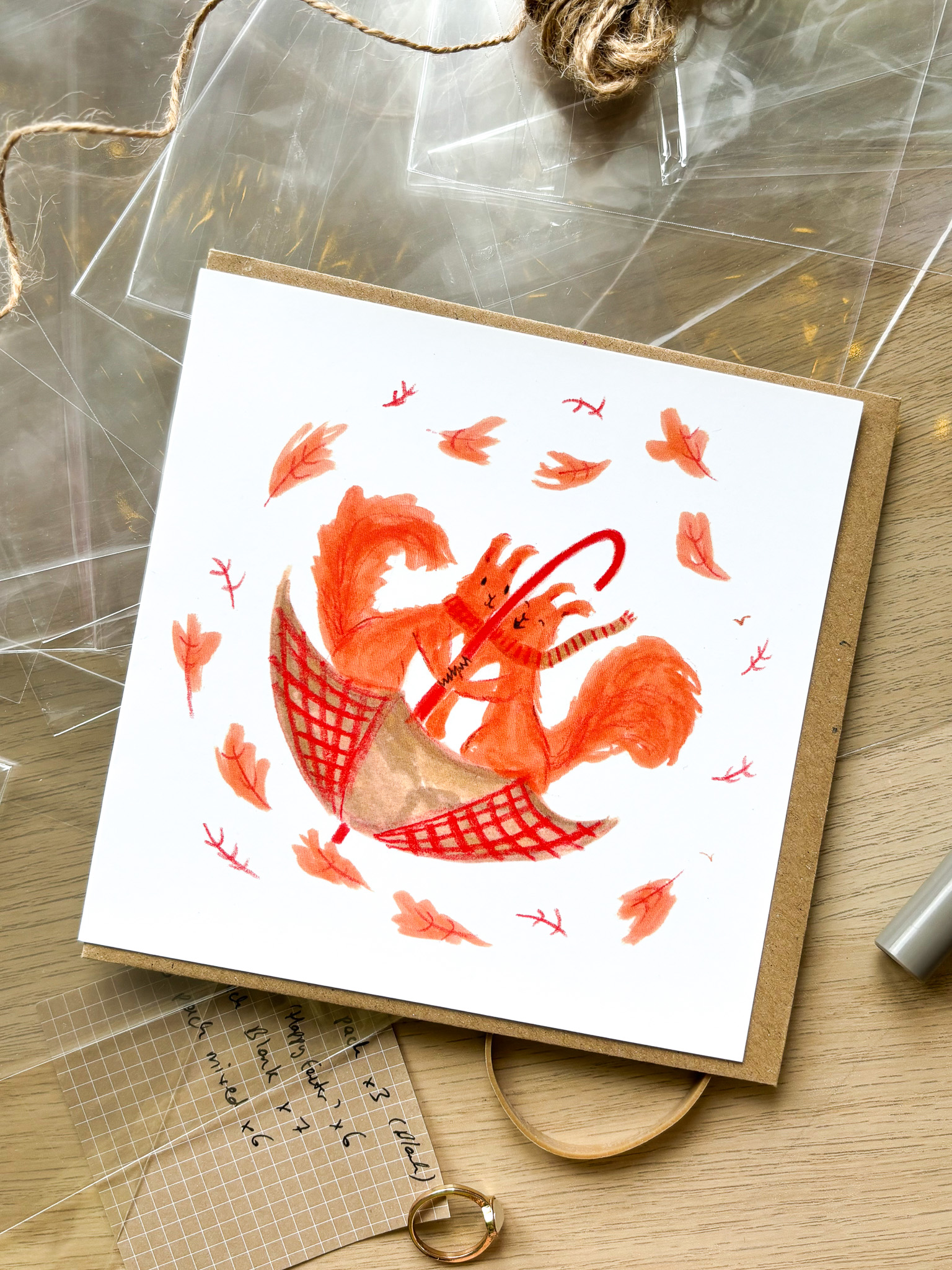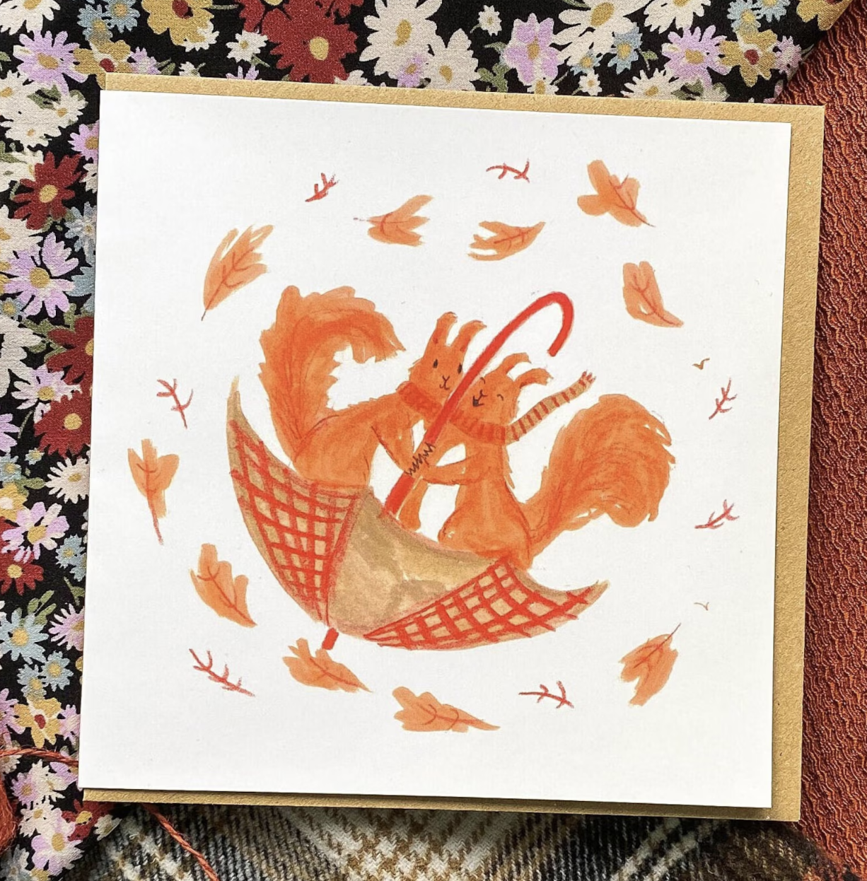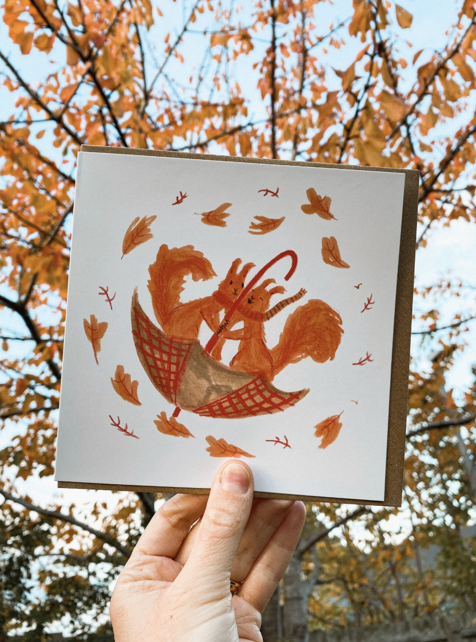 Add a touch of fun and charm to your message with this beautifully illustrated card, designed and created by me. Featuring a pair of windy squirrels holding onto an umbrella ☔ as they brave the breeze 🍃, this playful design is perfect for any occasion 💕