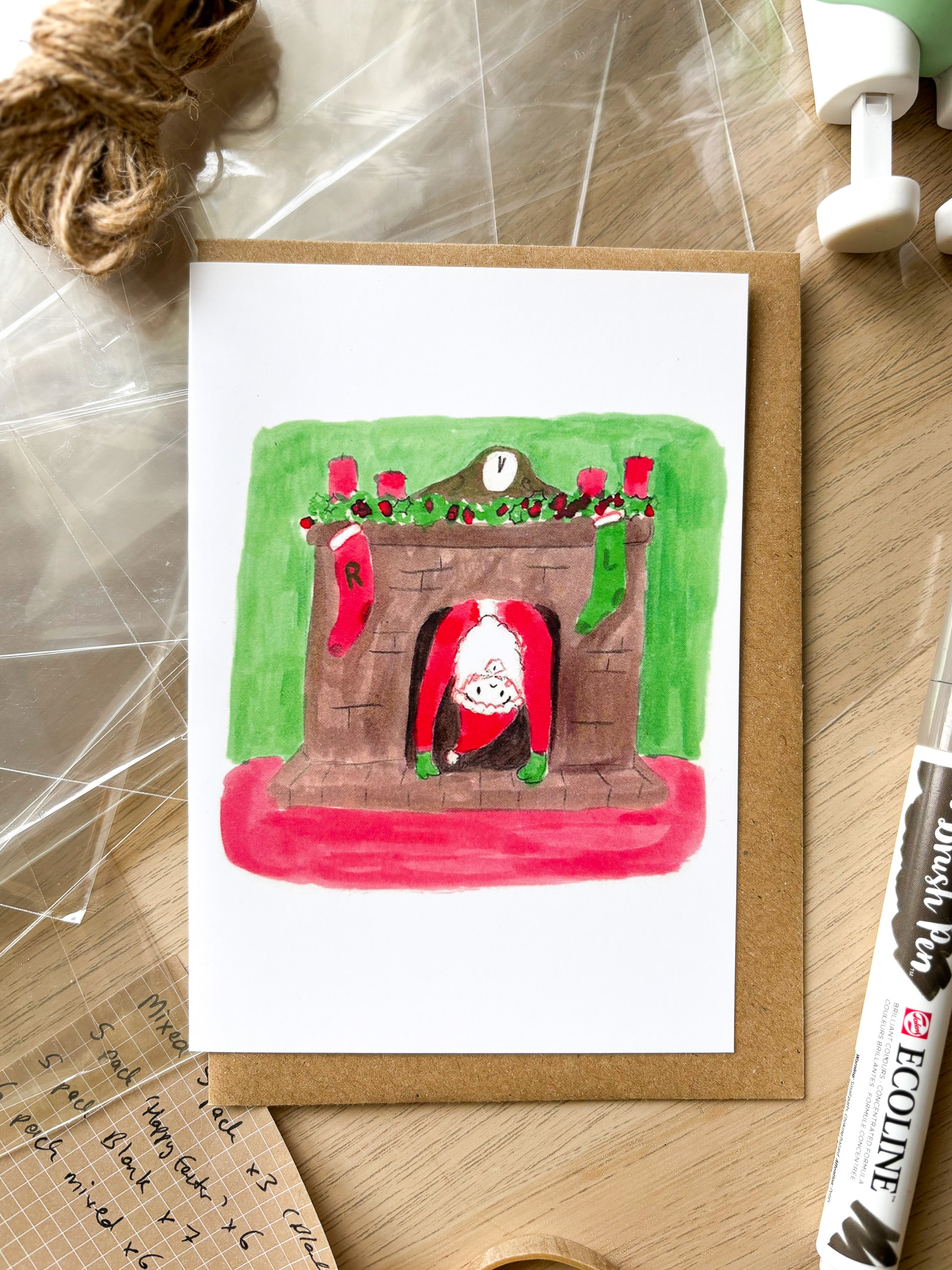 🎄 Hand-Illustrated Santa in Chimney Card – A6 🎅🔥