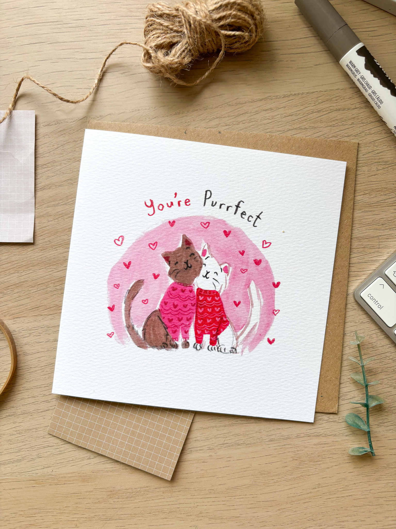 This adorable 148mm x 148mm Valentine’s card features a sweet pun and a heartwarming illustration of two cuddly cats! Designed and painted by me using watercolour and pencils, with added details in Procreate, this card is perfect for Valentine’s Day or any special occasion. The inside is left blank, so you can add your own heartfelt message.