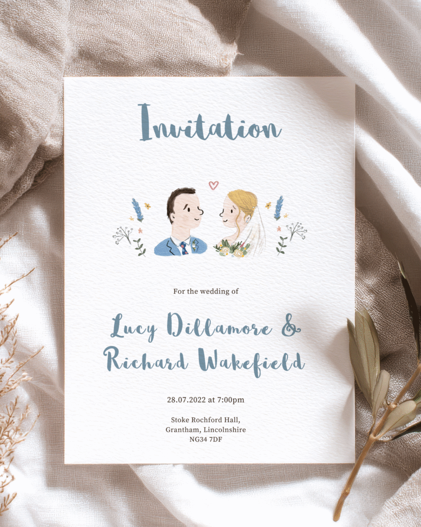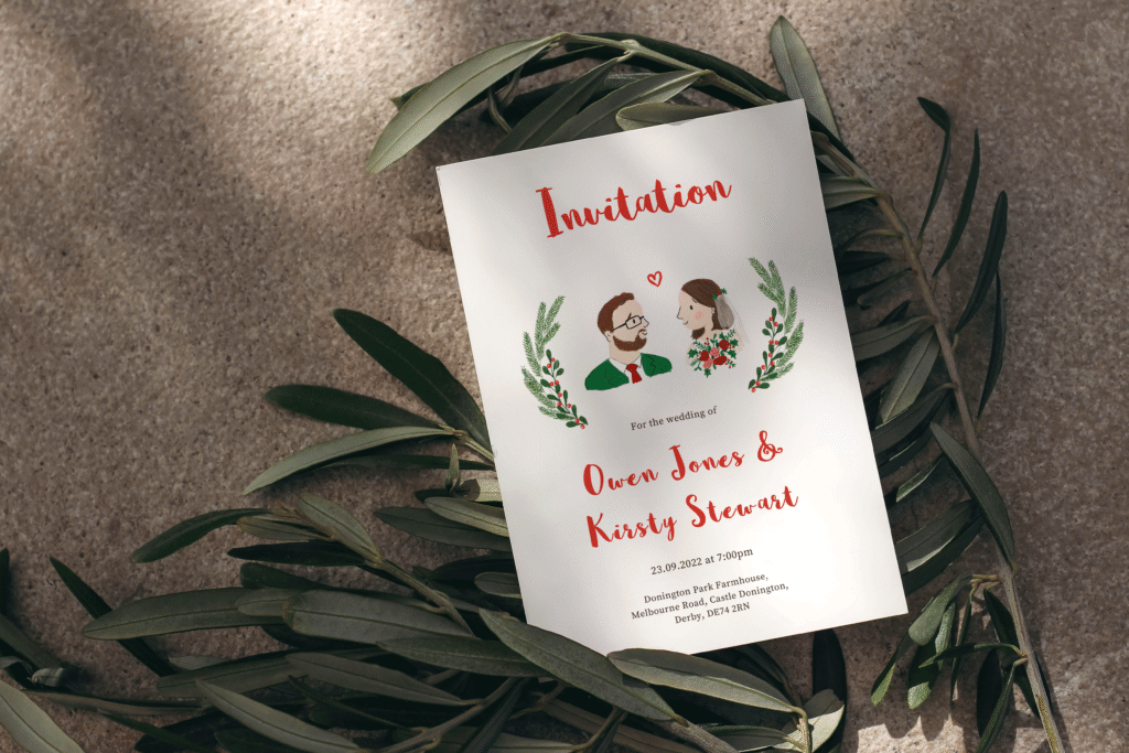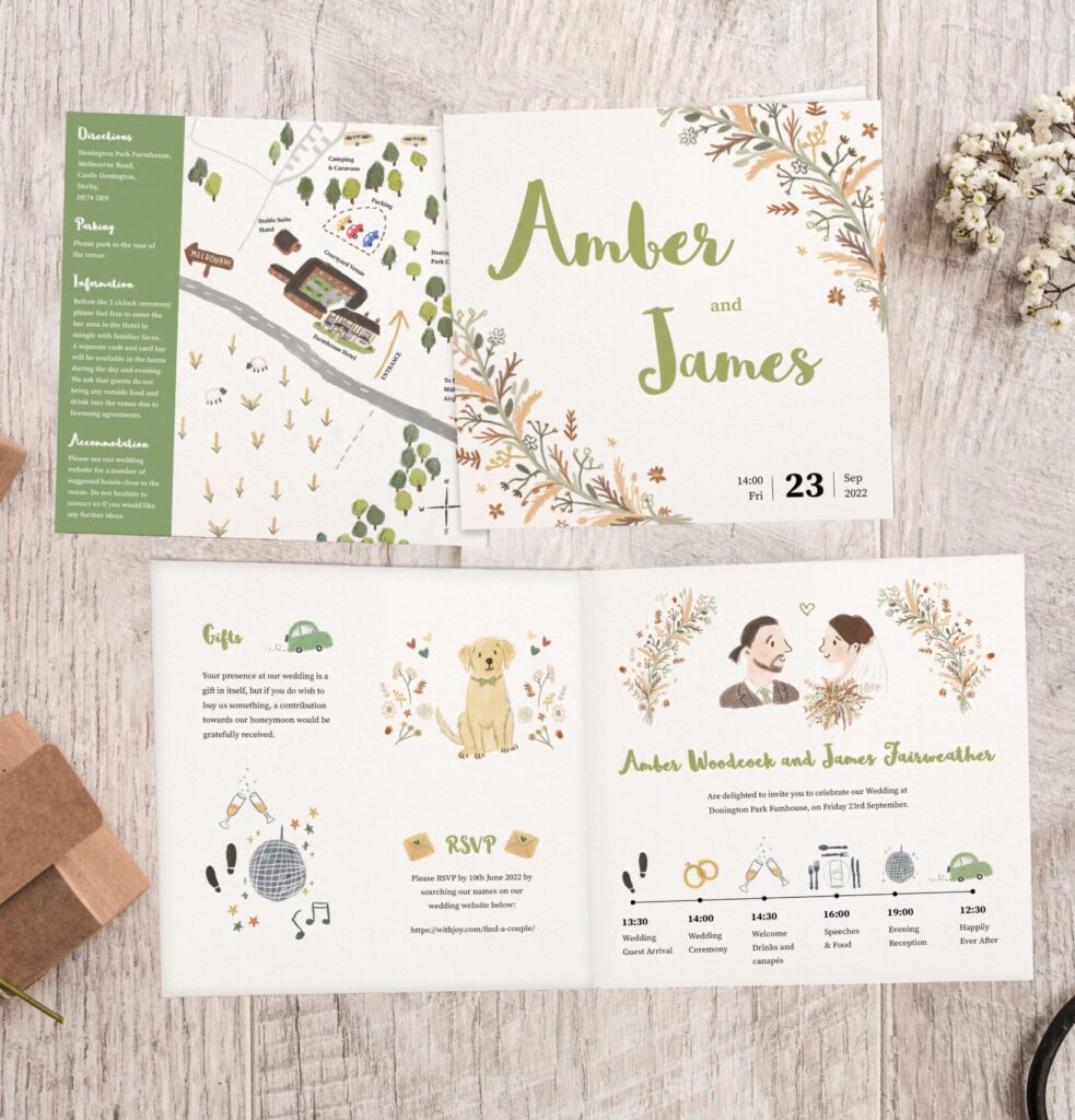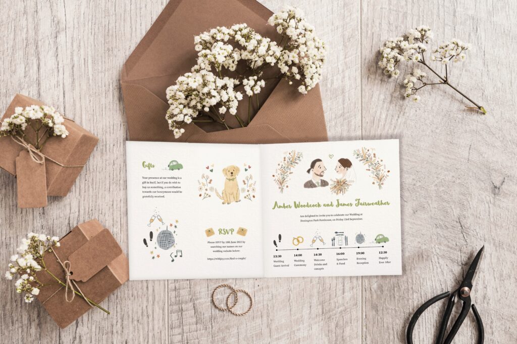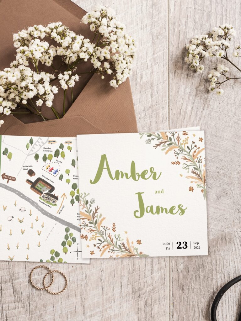 Choose between flat card or folded wedding invitations depending on your style and how much detail you’d like to include. Flat cards offer a clean, modern look, while folded designs give you extra space to organise your information.